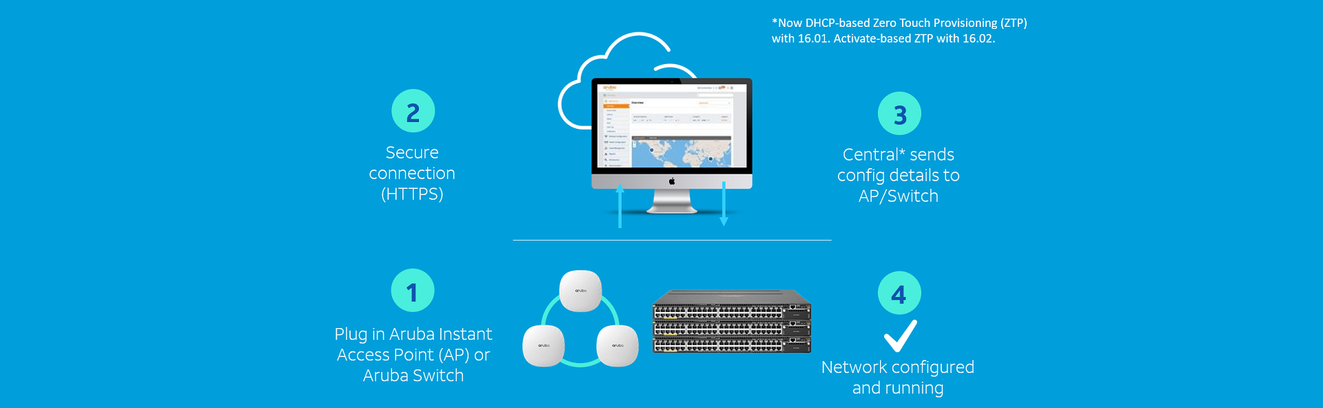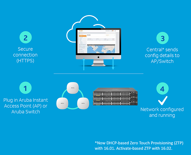 Zero-touch provisioning (ZTP): Regardless of location, unpacked and powered-up devices connect to a central interface and automatically receive their running configuration.
